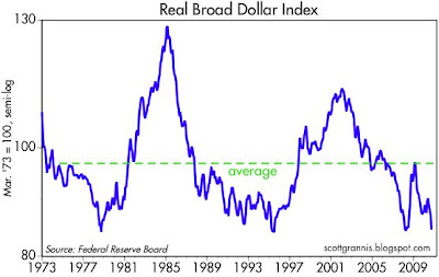 Последние данные от ФРС показывают, что доллар снова, в четвёртый раз с начала семидесятых годов достиг минимума. В настоящее время он настолько же слаб, как был октябре 78-го, июле 95-го, и апреле 08-го. Иными словами, американские туристы, путешествующие сейчас по мир.у могут обнаружить, что на доллар ещё никогда нельзя было купить так мало. Впрочем, сегодняшний доллар ещё никогда не покупал так мало золота, промышленных товаров, или такого малого набора потребительских товаров и услуг.